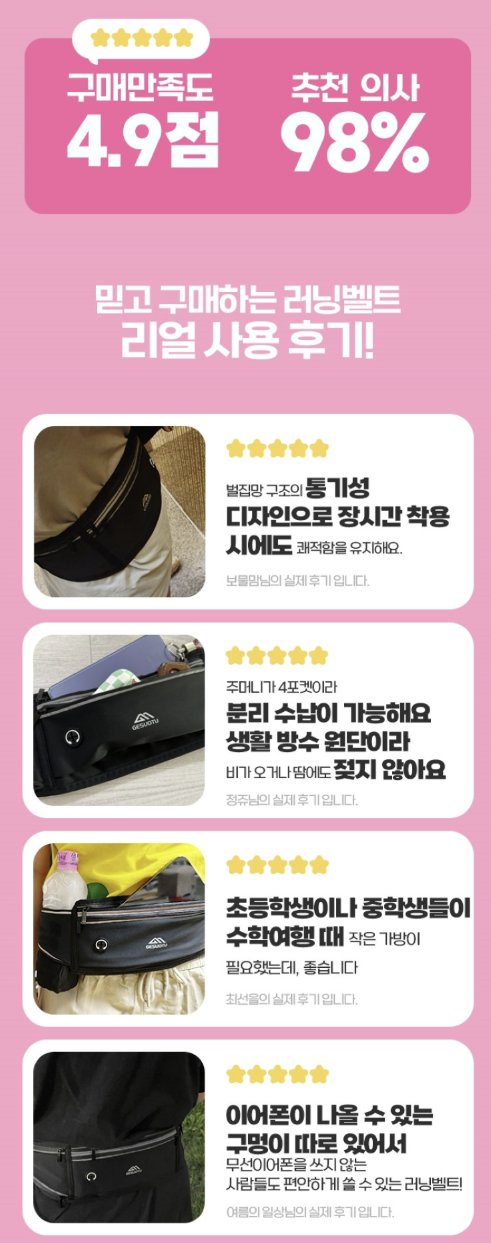 특히 허리에 안정적으로 고정돼서 장거리 러닝에도 전혀 불편하지 않다고 합니다.